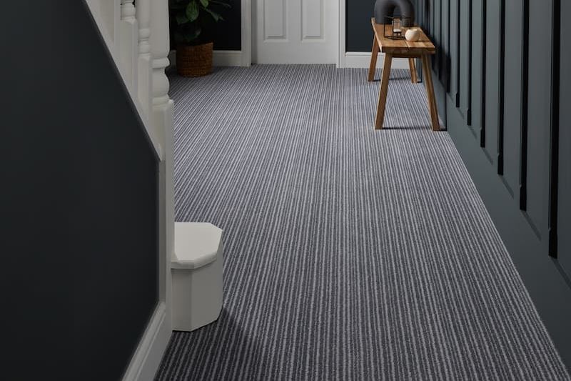 The collection is available in 4 metre and 5 metre widths however the stripe also benefits from the 1 metre width reducing waste especially when installing in halls, stairs and landings. The plain shades of this collection are available in two weights, Supreme and Regal, 41oz/yd² and 52oz/yd² respectively. The stripes are available in the higher 52oz/yd² pile weight (Regal Quality). In addition the carpet pile has a pin point finish due to the double shearing across the carpet pile.
